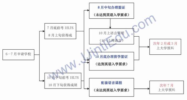 针对申请澳洲名校2月和3月开学的学生,我们建议学生在6月-7月底以前先申请学校,同时在7月底前先考一次IELTS,这样不但可以先占位,而且可以了解自己的英语水平,看是否有必要在开学之前加读语言课程。否则,学生很有可能因为专业被报满或者英语未达到要求而耽误半年甚至1年。